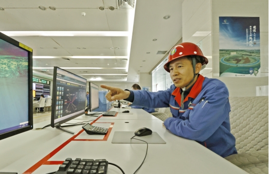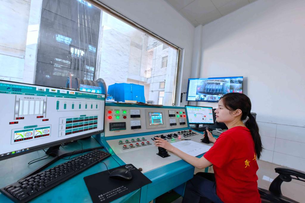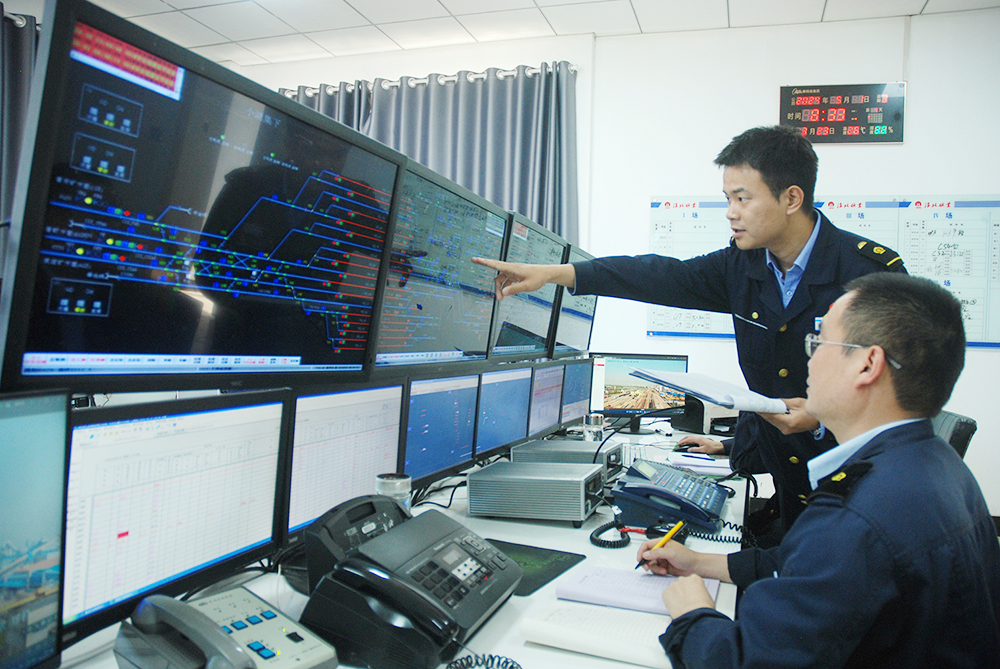 熱電分公司生產技術科科長劉國中在中控室檢查生產數據。