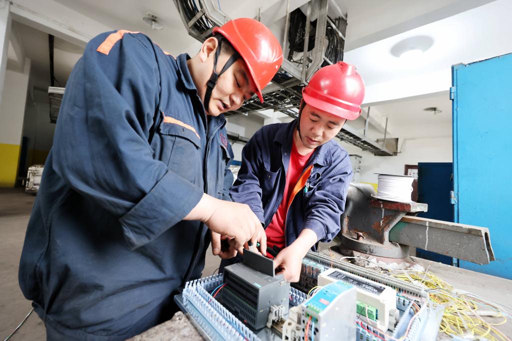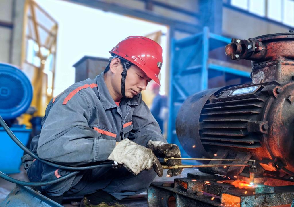 圖為機電科機修工王雷正在焊接電機