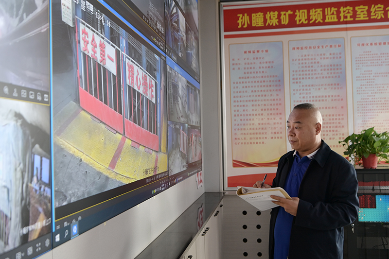 在該礦視頻監控室,面對6塊監視大屏的24個作業點,安監員王建兩眼來回逡巡,緊盯屏幕,認真觀察每一個作業場所的規范作業情況,時而在隱患登記簿上記錄,時而拿起電話聯系,為礦井守好安全生產的第一道關口忙得不亦樂乎。