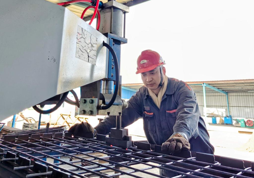 圖為機電科支護工趙永羅正在焊制鋼筋網
