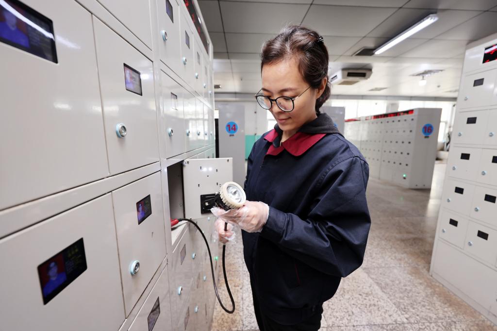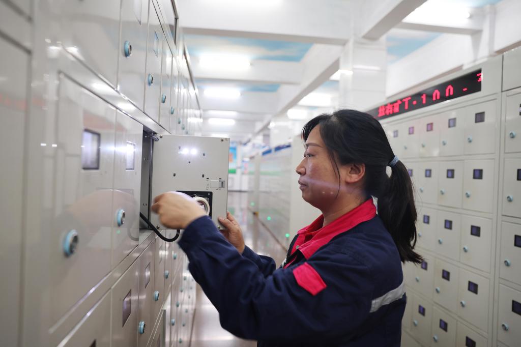 圖為該礦保運區燈房女工王方正在檢查礦燈充電情況。