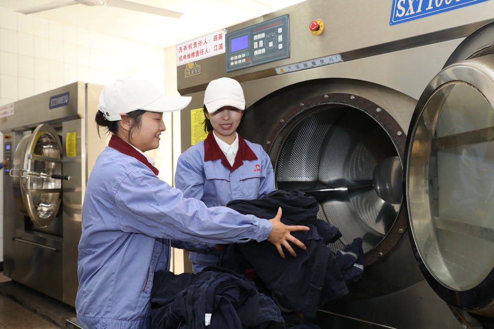 該礦物業管理科洗衣房女工趙文芳、李程程清洗工作服。