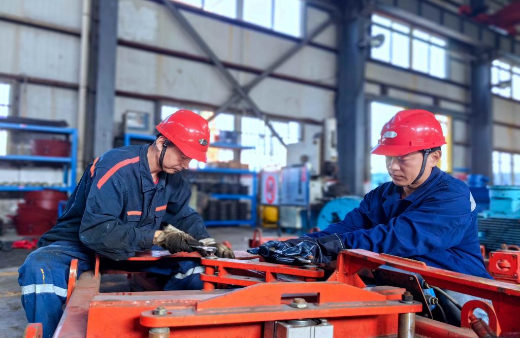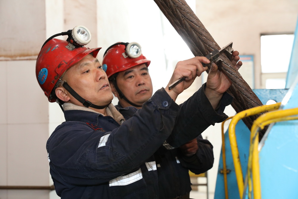 該礦保運區職工宋清杰(左)與工友查驗主提升鋼絲繩。