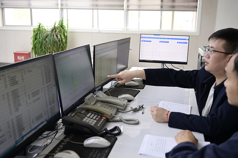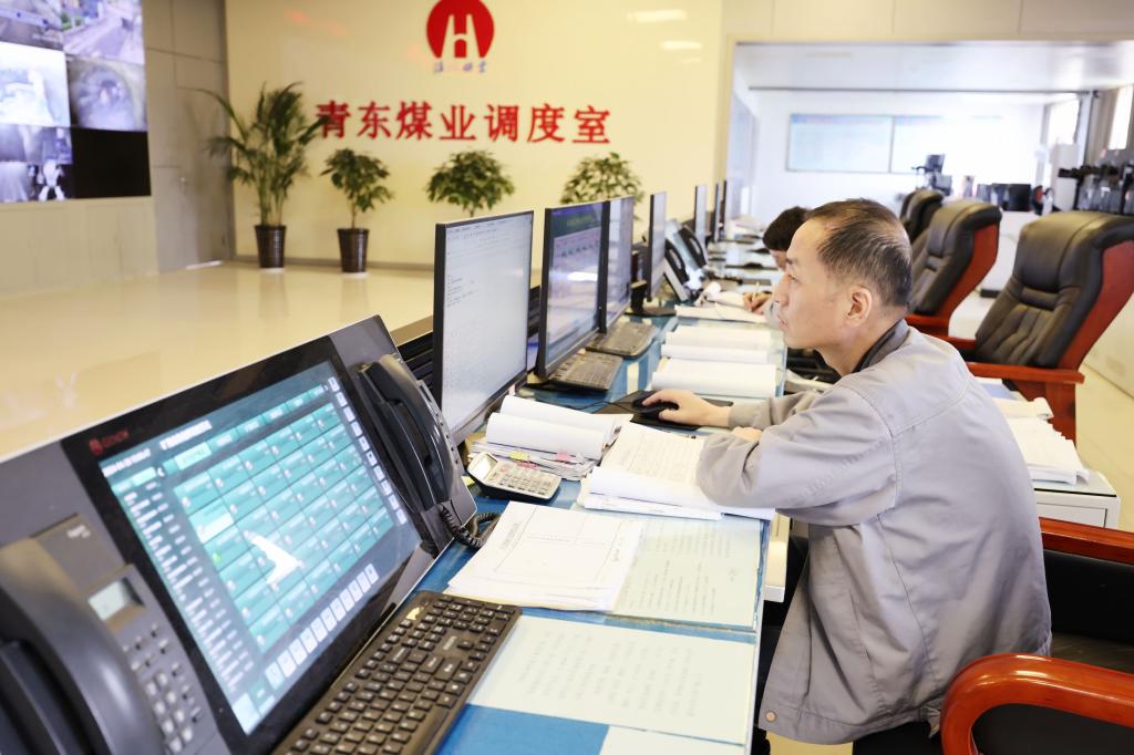 在調度指揮中心,季躍、郭路路兩人正在線上比對監測數據。“五一”期間,為讓工友享受假期快樂時光,他們放棄輪休的機會,選擇堅守在崗,全天候監測各類安全數據變化,用行動守護礦井安全。