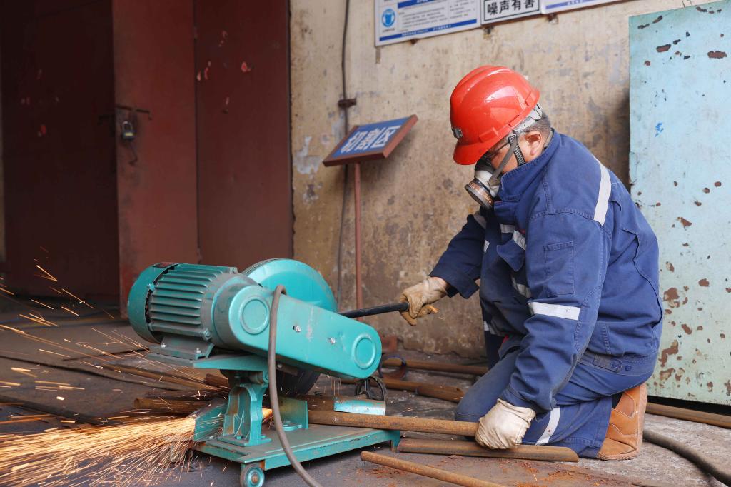 圖為該礦機電科(機廠)職工曹輝正在切割加工材料。
