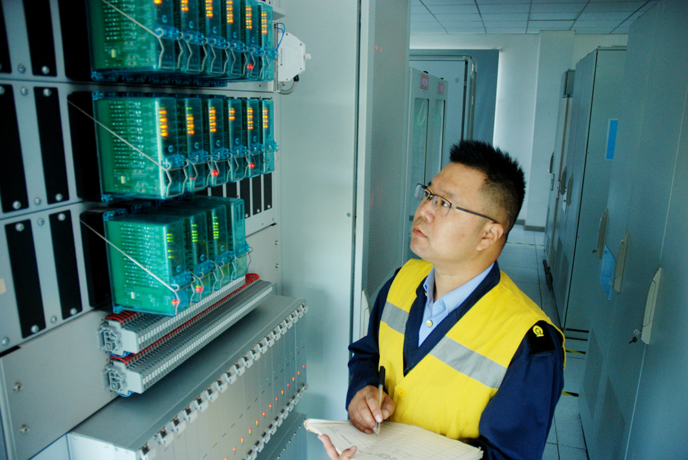 圖為臨渙電務段信號領工區領工長石磊查看信號聯鎖機房信號集中監測系統運行情況