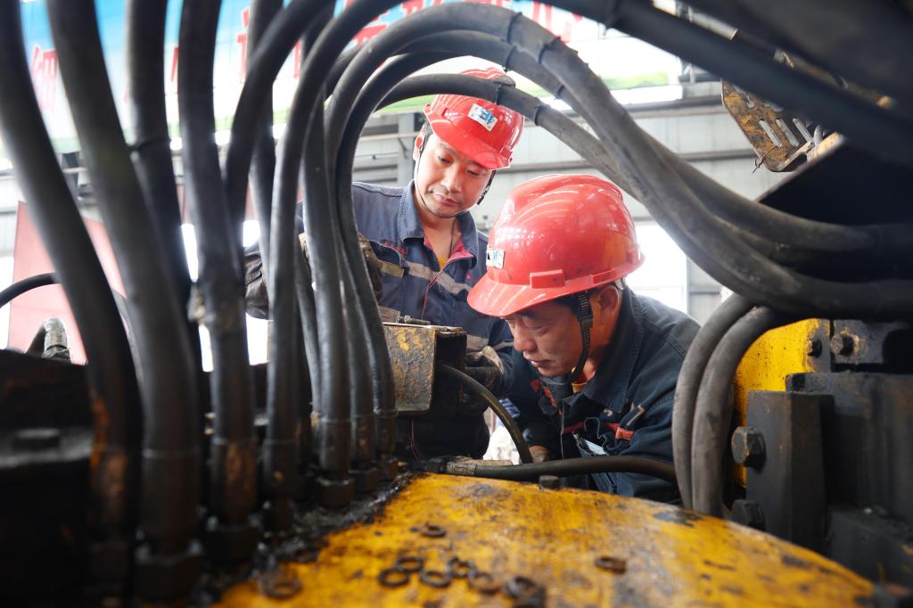 圖為該礦機電科(機廠)職工陳興開、徐輝正在維修井下挖掘機。