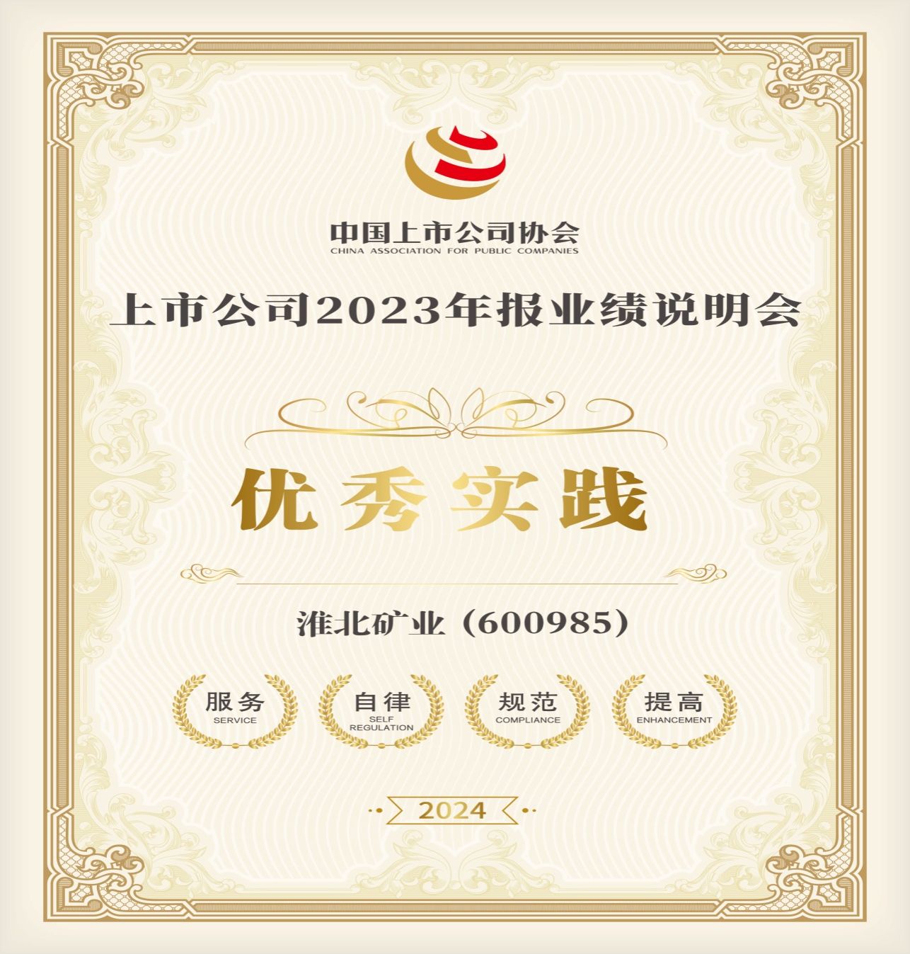 近日,中國上市公司協(xié)會(huì)發(fā)布“上市公司2023年報(bào)業(yè)績說明會(huì)最佳及優(yōu)秀實(shí)踐”榜單,淮北礦業(yè)控股股份有限公司憑借高質(zhì)量的年報(bào)業(yè)績說明會(huì),在5000余家上市公司中脫穎而出,榮獲“2023年報(bào)業(yè)績說明會(huì)優(yōu)秀實(shí)踐”獎(jiǎng)項(xiàng)。